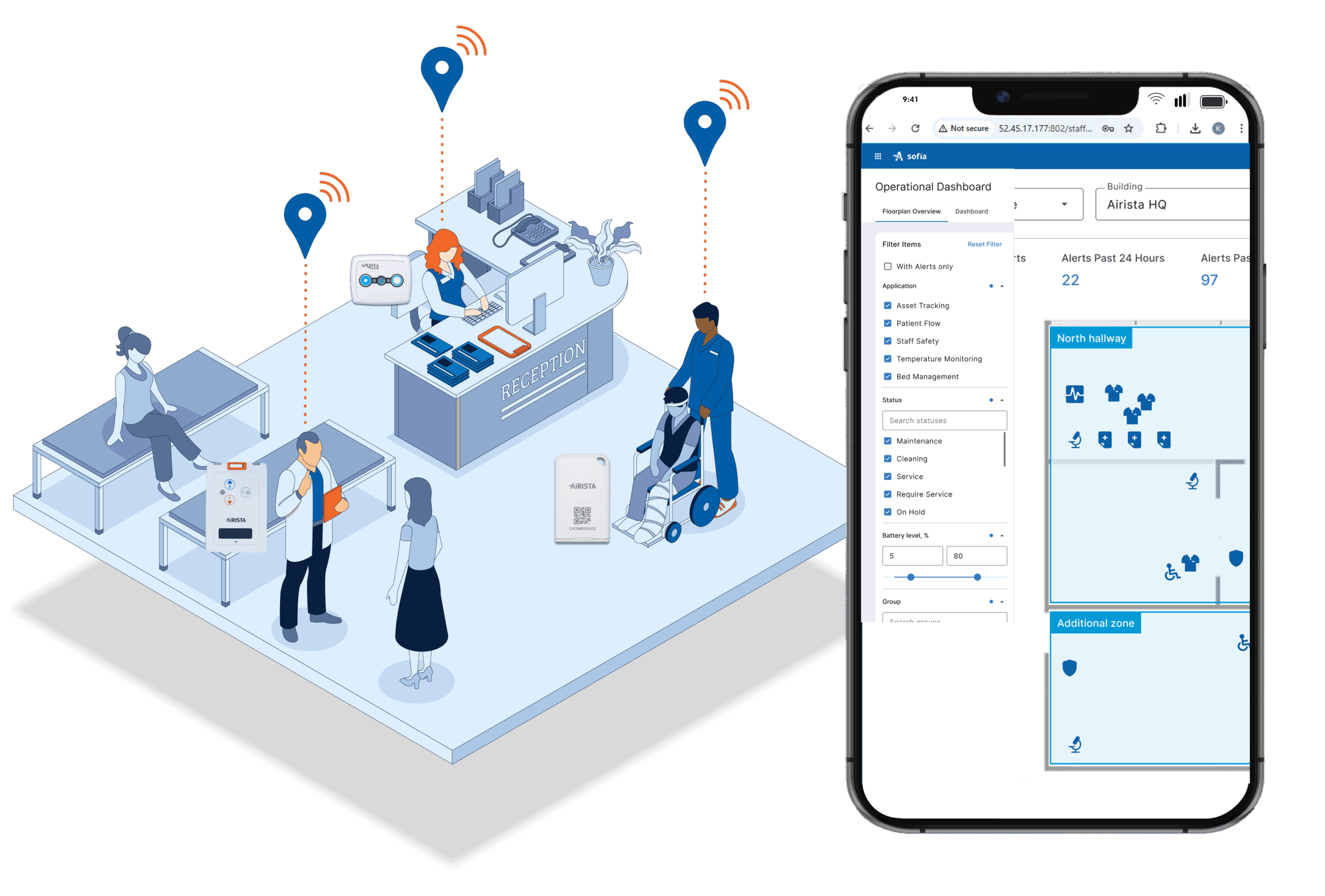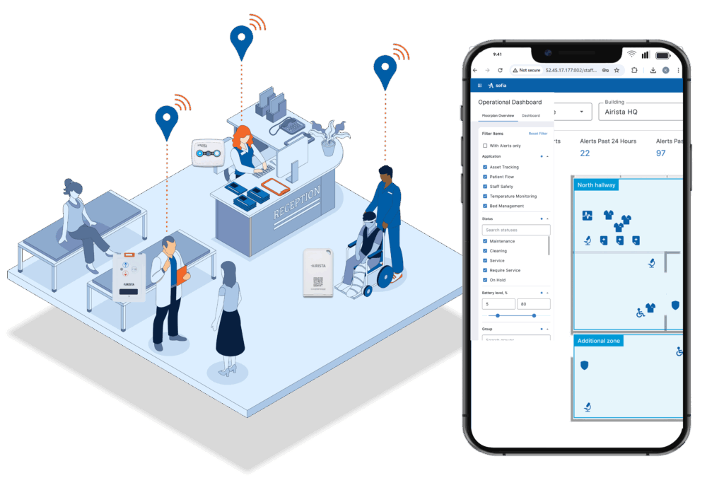 Workflow and analytics features: | Sofia has the ability to create custom dashboards and reports. The built-in rules engine makes it easy to create custom alerts and trigger actions in external systems. Example rules are for zone entry/exit/dwell/absence, button pushes, PAR level, and motion. | Nuse call automation, staff duress, asset tracking, patient flow, analytics, contact tracing, interfaces | Near real-time location data across thousands of assets. Integrated with PowerBI, it delivers analytics and reports on asset utilization, travel history, PAR levels, and equipment loss prevention. | Automation of clean equipment distribution, automation of soiled equipment pick up, automation of transport equipment staging, mobile equipment utilization and availability metrics, preventative maintenance schedules, environmental monitoring, hand hygiene compliance rates by floor and department | A user-friendly, cloud-based enterprise platform that automates workflows, enhances staff efficiency, and supports compliance. Built-in analytics deliver actionable insights, milestone tracking, and a holistic view of interactions to identify bottlenecks and optimize operations. | Customizable reporting, alerting, and dashboards are incorporated into all of our solution suites; for example asset utilization, patient & staff safety alerting, hand hygiene compliance, environmental monitoring, and patient and staff workflow. |