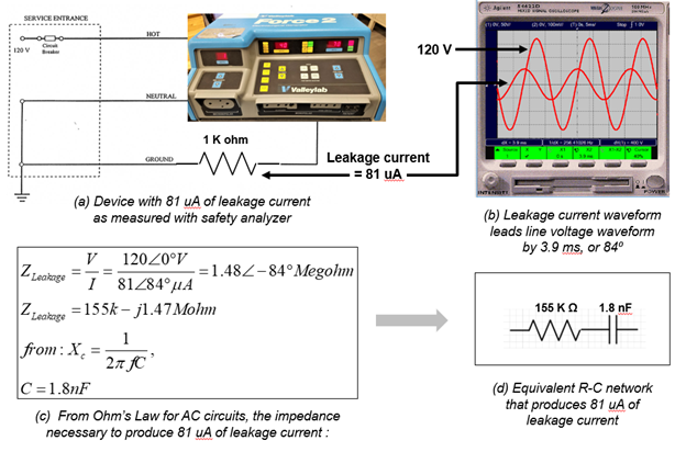As described in Figure 1, the impedance of either this real or virtual R-C network determines the magnitude of the available and measured leakage current and can be readily determined experimentally. Here, and in Figure 1(a), a leakage current of 81 μA is conventionally measured with a safety analyzer. It can also be displayed as an 81-mV signal across a 1K ohm current sense resistor, along with the incoming 120-volt (RMS) signal powering the device (Figure 1(b). Because the leakage current leads the voltage producing it, this automatically implies that a resistive-capacitive impedance is present. The magnitude and phase of this impedance can be calculated, Figure 1(c). Its rectangular form now reveals the equivalent values of the series R-C network shown in Figure 1(d). It is such an electrical equivalent that couples the ‘hot’ side of the power line to the device’s case and establishes the magnitude of the now-available leakage current.