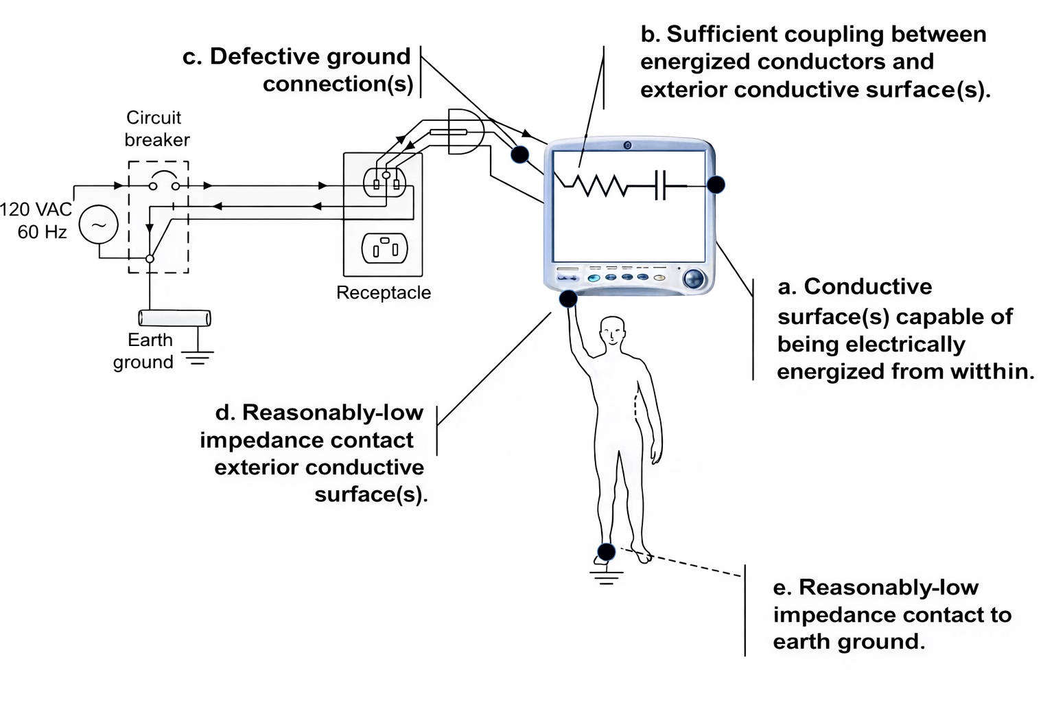 As illustrated in Figure 2, for a patient or staff to experience an electrical macroshock from a medical device, five independent and necessary conditions must all be present simultaneously: