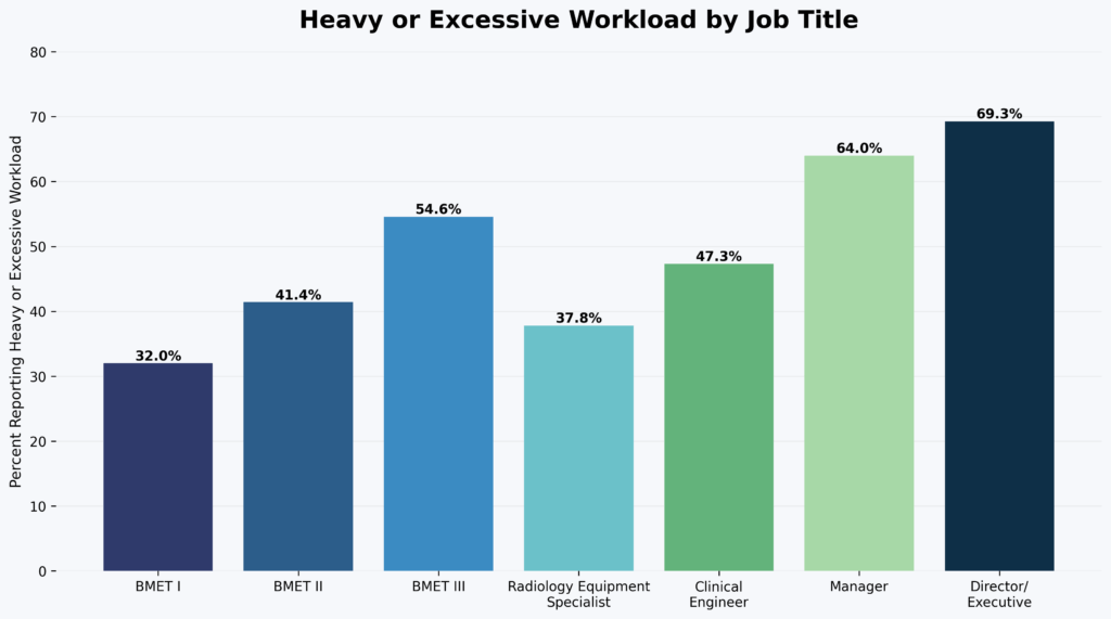 Compounding these issues is a persistently heavy workload. Nearly 70% of directors and 64% of managers describe their workload as “heavy” or “excessive.” Senior BMETs are also feeling the strain, with nearly 55% reporting a heavy or excessive workload. Respondents attribute this to a variety of factors, including staff shortages, organizational growth, and expanding responsibilities. “It seems like there is always a need to expand job responsibilities but little interest or understanding from our administration in increasing the number of FTEs to support the additional work,” one professional wrote. Another stated simply, “We are short 2 techs.”