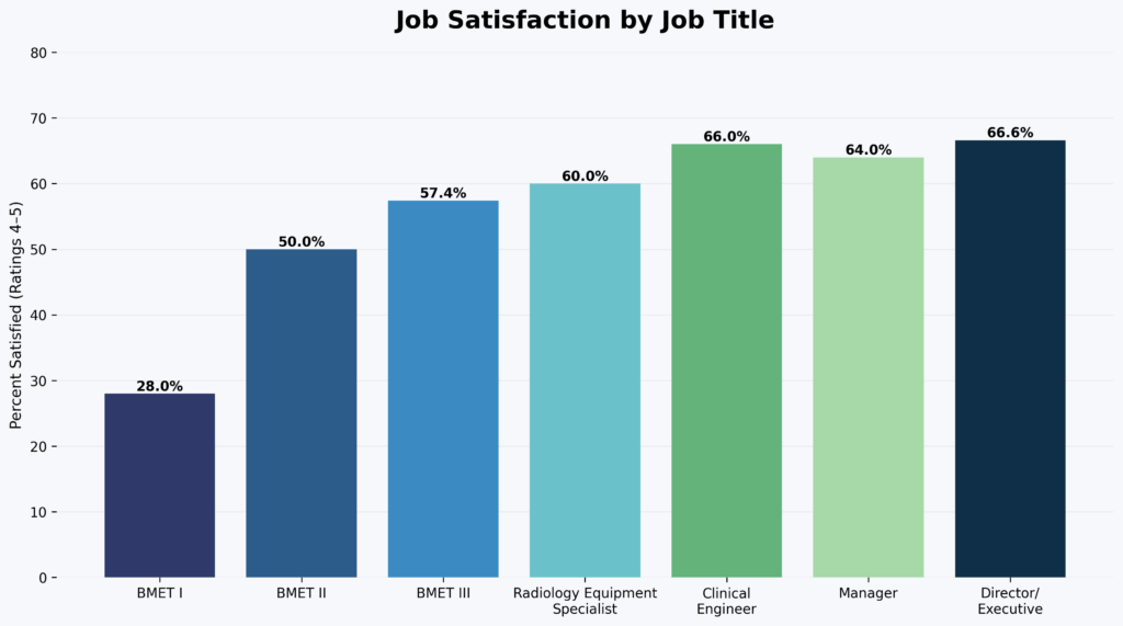The sentiment is more muted among early-career professionals. Entry-level BMET Is report the lowest satisfaction, with more than half rating their job a 3 or lower and only one respondent (4%) describing themselves as “very satisfied.” This dissatisfaction may be linked to compensation and perceived opportunities for advancement. Nearly half of BMET Is rated their promotion opportunities as poor or below average.