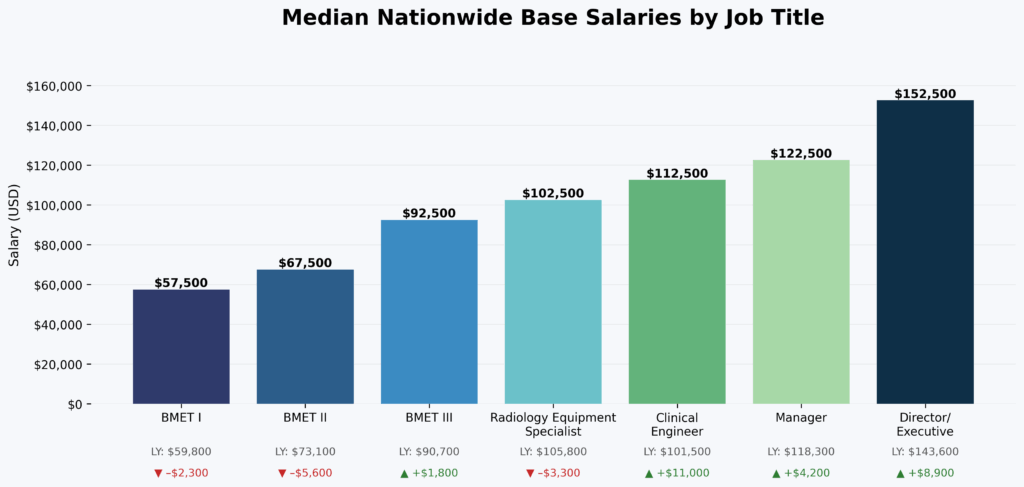 However, this upward trend did not extend to all roles. Median salaries for BMET IIs declined to $67,500, down from $73,100 in 2024. Entry-level BMET Is also experienced a slight dip, with median pay settling around $57,500 compared to $59,800 the previous year. Radiology equipment specialist median pay also declined to $102,500 in 2025, down from $105,800.