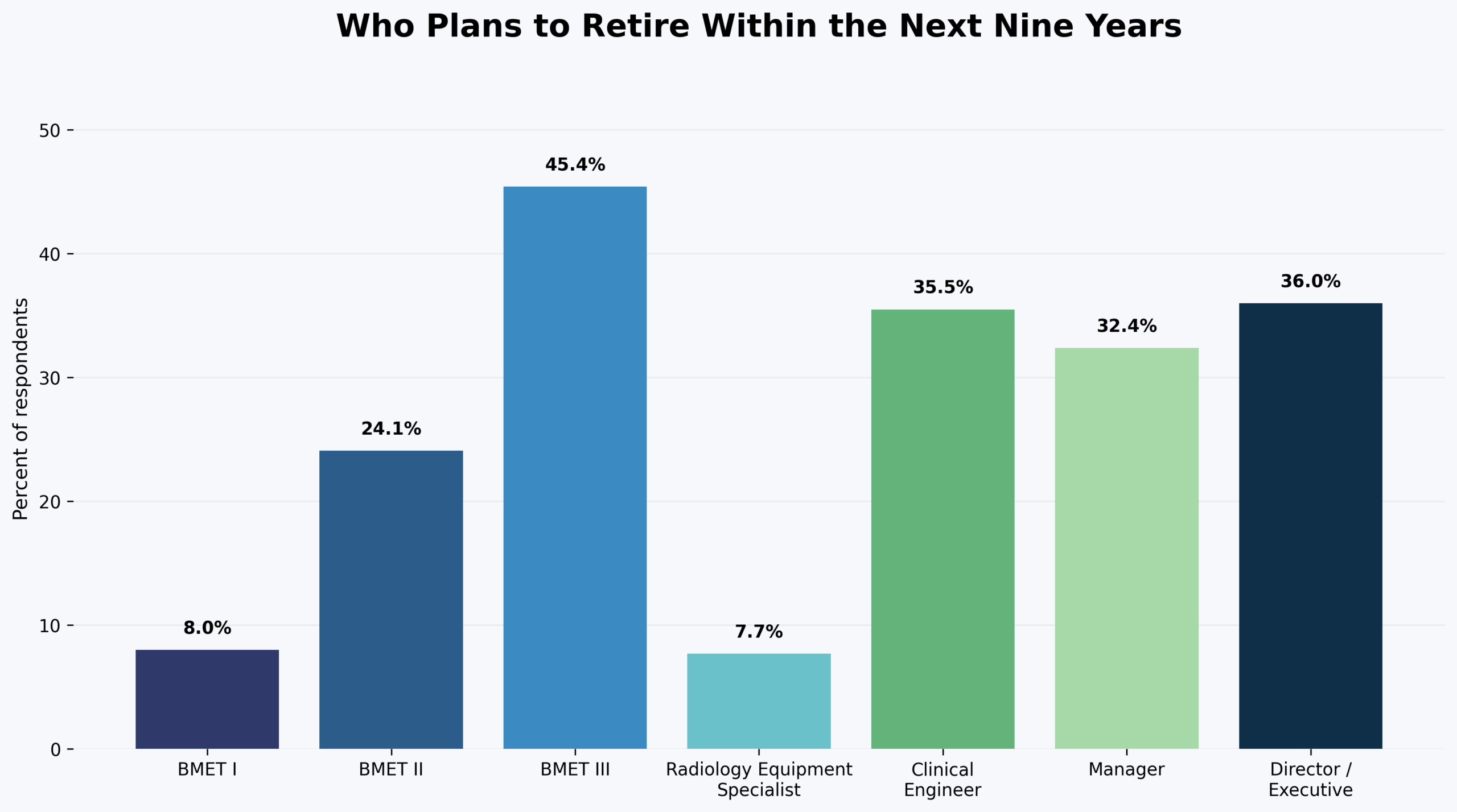Retirement timelines confirm the impending challenge. About 45% of BMET IIIs plan to retire within the next nine years. Retirement risk is also elevated among leadership and clinical engineers, with roughly one-third of managers (32.4%), directors (36%), and clinical engineers (35.5%) indicating near-term retirement plans. This exodus of institutional knowledge and experience is set to collide with what many respondents describe as a severe shortage of new talent entering the field.