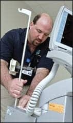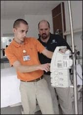 | RTLS benefits include full facility coverage, scalability, and improved patient care. Here, Senior BMET Richard Wheeler tests a balloon pump and places an asset tracking tag on the device. | ||